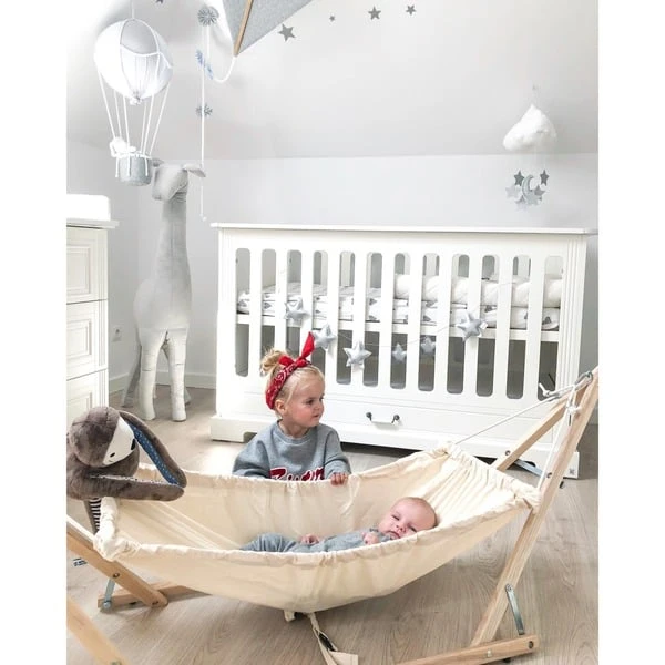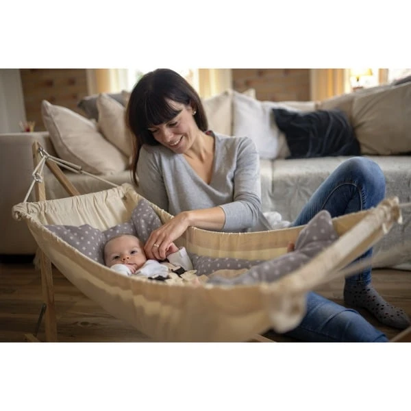 Die Koala ist eine Babyhängematte, in der das Baby geschützt von der Außenwelt sanft schaukelnd entspannen kann. Sie ermöglicht der Wirbelsäule des Kindes sich zu erholen und passt sich dem Bedürfnis nach einem gerundeten Rücken an. So liegt das Baby definitiv richtig. Der gerundete Rücken mit dem Babys zur Welt kommen wird durch die Form der Koala optimal unterstützt. Innerhalb des ersten Lebensjahres streckt sich die Wirbelsäule langsam. Ein behutsamer Prozess der erst beendet ist, wenn das Kind freistehen kann und zu laufen beginnt. Im Gegensatz zu einer harten Matratze erlaubt die Hängematte der Babywirbelsäule sich tagsüber zu erholen und verhindert sogar einen platten Hinterkopf. Vor dem Herausfallen schützt ein eingenähtes Sicherheitshöschen mit integrierten Haltegurten. An den Fußstreben, direkt unter der Hängematte, ist ein Schaukelbegrenzer angebracht. Die Hängematte wird dort mit einem Klickverschluss fixiert, damit sie beispielsweise von älteren Geschwisterchen nicht zu stark geschaukelt werden kann. Die Koala wurde auf Sicherheit des Produktes, die Einfachheit der Handhabung und auf Schadstoffe erfolgreich getestet. Sie ist kaum grösser als ein zusammengeklappter Sonnenschirm, leicht und handlich. Dazu lässt sich die Koala Hängematte schnell einpacken und überall mit hinnehmen. Auf- bzw. abgebaut ist sie ohne Werkzeug in unter zwei Minuten.Art.-Nr.: 1792294