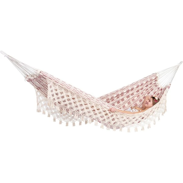 Die Hängematte Rio wird traditionell in Brasilien in Handarbeit hergestellt. Für die einzigartige Jacquard-Webtechnik wird ein ganz besonderer Webstuhl benötigt: Dadurch wird der Webstoff extra weich und bequem und macht Rio auch optisch zum Highlight. Dazu kommt ein besonders schöner Schmucksaum, Veranda genannt, der in Brasilien für Luxushängematten ein Muss ist! Für eine hohe Lebensdauer werden extradicke Schnüre per Handarbeit mit einem Webband verbunden, damit auch hohe punktuelle Belastungen ausgeglichen werden können.Art.-Nr.: 1593202