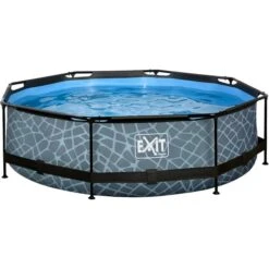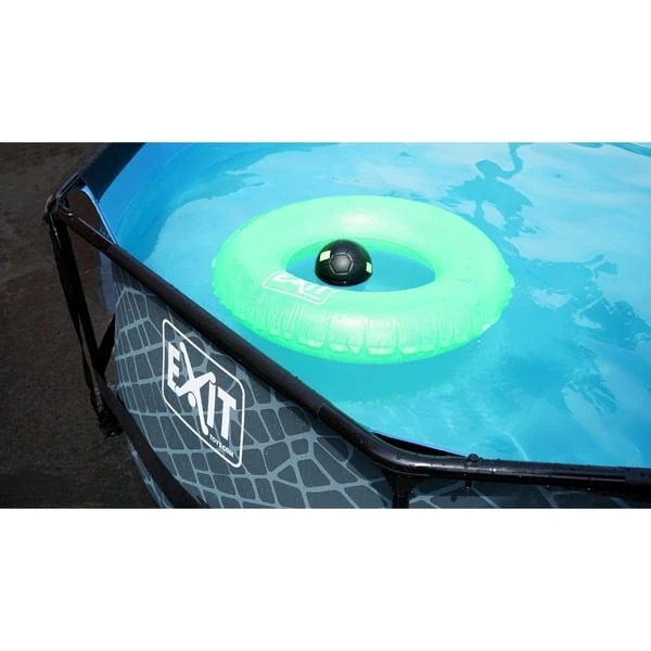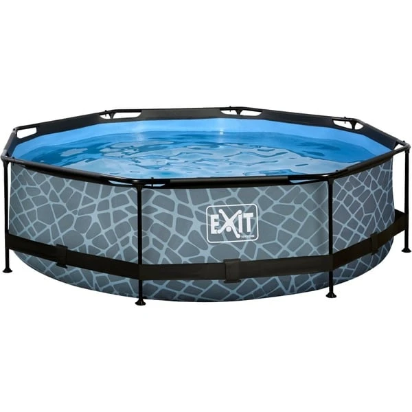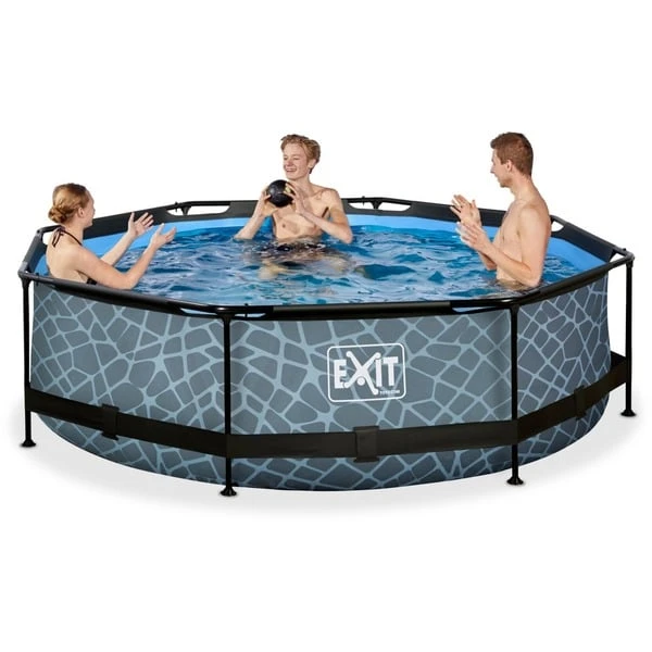 Der EXIT Stone Pool Ø 300 x 76cm ist ein runder Stahlrahmenpool mit Steinoptik. Der kompakte Pool ist standardmäßig mit einer Filterpumpe ausgestattet und fällt durch sein rustikales Steinmuster zwischen anderen Pools auf. Der pulverbeschichtete stählerne Rahmen und die die starken Eckpunkte des EXIT Stone Pools sorgen dafür, dass der Pool immer stabil steht und jahrelang genutzt werden kann. Die mitgelieferte Filterpumpe hält das Wasser sauber und in Bewegung, so dass einer Verschmutzung des Wassers entgegengewirkt wird. Das Steinmuster und der schwarze Rahmen geben dem Stone Pool eine einzigartige Ausstrahlung und dank des natürlichen Aussehens integriert sich der Pool völlig in den Garten. Die Innenseite des Pools ist erfrischend blau. Die runde Form des hochwertigen Rahmenpools schafft eine gemütliche Atmosphäre und sorgt dafür, das man mit bis zu vier Personen Badespaß im Pool erleben kann.Art.-Nr.: 1782990