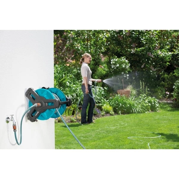 Das GARDENA Classic Wand-Schlauchtrommel 50 Set (8009-20) ist mit einem 20 Meter langen Schlauch von 13mm (1/2“) Durchmesser, einer GARDENA Classic Spritze und allen nötigen Original GARDENA Systemteilen ausgestattet. Damit eignet sich das Set besonders für kleine bis mittlere Gärten. Die Schlauchtrommel unterstützt die Arbeit dabei mit der schonenden Aufbewahrung des Gartenschlauches sowie der Möglichkeit den aufgerollten Schlauch schnell und bequem zu transportieren. Die freilaufende Handkurbel erlaubt die leichte Bedienung der Handtrommel und kann außerdem zur platzsparenden Aufbewahrung eingeklappt werden. Eine Wandhalterung samt Schrauben, Dübel und Montageanleitung ist im Lieferumfang enthalten und gewährleisten eine kinderleichte Montage. Ein abgewinkelter Schlauchanschluss verhindert ein umknicken des Schlauches und gewährleistet so den vollen Wasserdurchfluss. Eine drehbare Anschlussachse verhindert, dass sich der Anschlussschlauch beim Auf- und Abrollen mit dreht. Ein integrierter Nachtropfstopp ermöglicht außerdem, dass nach Gebrauch und beim Transport kein Restwasser aus dem Schlauch tropft. So bilden sich auch bei der Lagerung des Schlauches keine Wasserpfützen durch auslaufendes Wasser. Durch die dreieckige Bauform der Seitenteile und den tiefen Schwerpunkt bekommt die Trommel eine hohe Standfestigkeit und kippt nicht leicht um.Art.-Nr.: 1213875